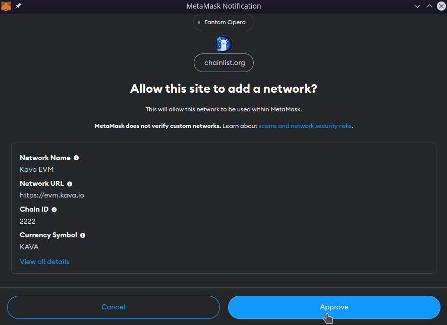 Add To Metamaskbutton of your target chain, then clickApprove.