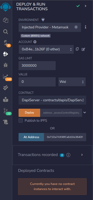 DapiServer.sol, select the properENVIRONMENT,CONTRACTand enterDapiServer.sol's address on Mumbai Testnet next toAt Addressbutton in theDeploy & run transactionsection and click theAt Addressbutton and click deployed contract.Find the