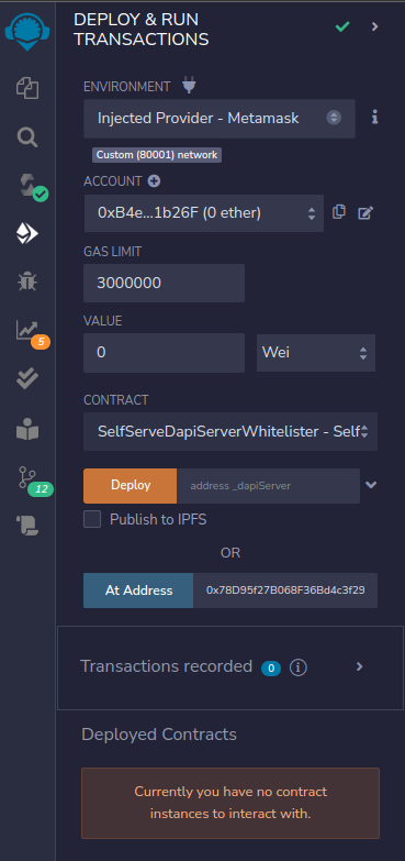 Deploy & run transactions. SelectInjected Provider - MetamaskfromENVIRONMENT, selectSelfServeDapiServerWhitelister.solfromCONTRACTand enterSelfServeDapiServerWhitelister.sol's address on Mumbai Testnet next toAt Addressbutton as in the below image and click theAt Addressbutton.